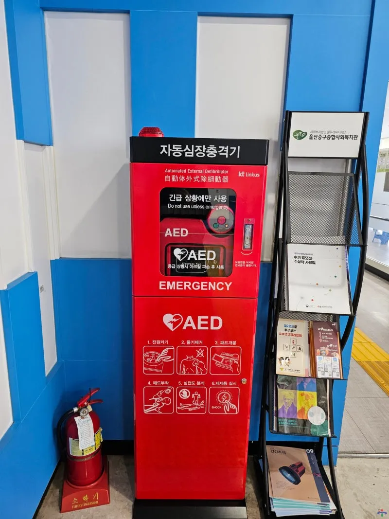 자동심장충격기는 2층 엘리베이터 앞쪽에 위치해있습니다.