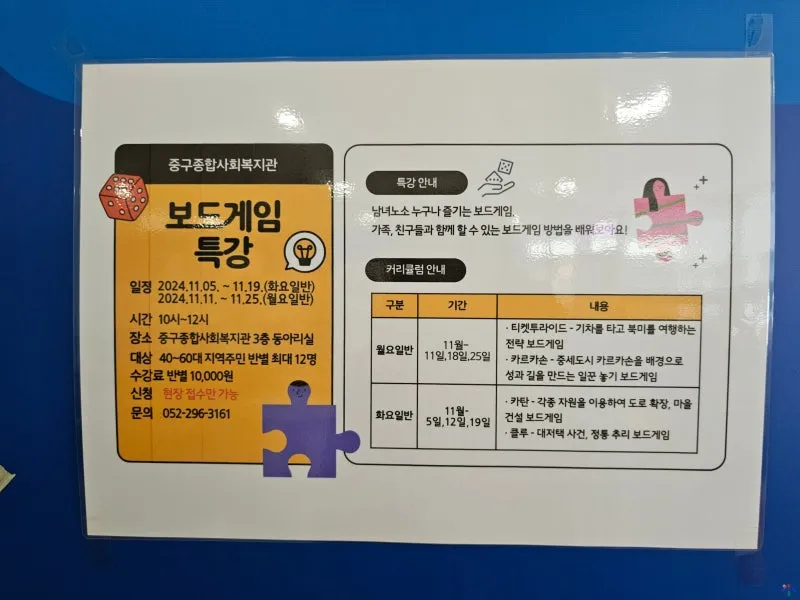 11월에 운영되고 있는 보드게임 특강이에요. 수강료도 저렴하고, 최대 12명이라 더 재밌게 즐길 수 있을 것 같네요.