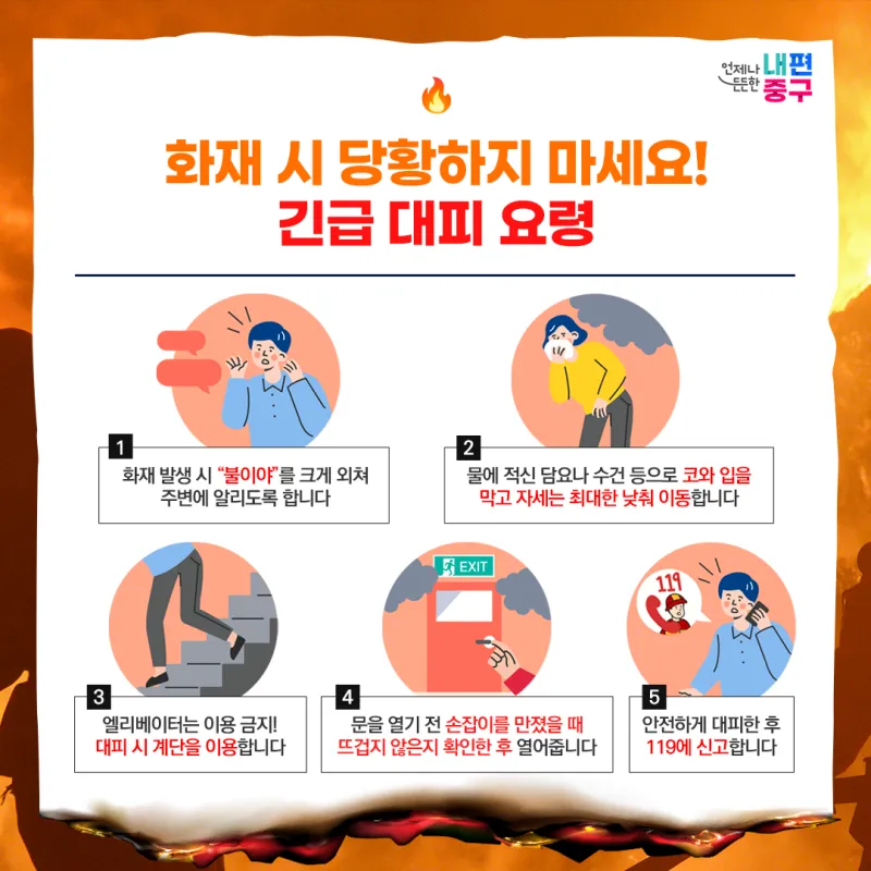 1. 화재 발생 시 “불이야”를 크게 외쳐 주변에 알리도록 합니다