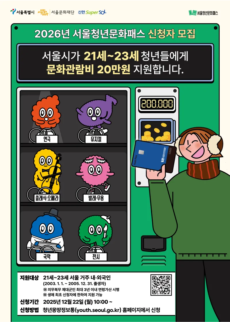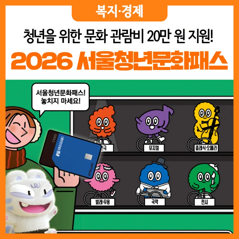 21~23세 청년 주목! 2026년 서울청년문화패스 조기 모집 시작, 청년 문화관람비 20만 원 지원(12/22~)