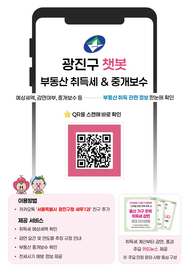 ????????♀️ 대상 · 부동산 취득 예정 민원인 및 관내 공인중개사 등 ???? 기간 · 2026년 1월부터 상시운영 ✍???? 이용 방법 · 카카오톡에서 '서울특별시 광진구청 세무1과' 친구 추가 ✅ 주요기능 ???? <부동산 취득세> • 생애최초 주택취득, 출산양육자에 대한 감면 자가진단 ※ 9문항에 대한 응답 기반으로, 추징 규정까지 포함하여 감면액 사전 안내 • 조건 입력형 취득세 예상세액 자동 계산 • 주택 수, 면적 등 입력 시 최신 법령 반영한 예상세액 제공 • 상속 취득의 경우 1가구 1주택 세율 특례까지 한번에 확인 • 착오 빈발 사례 중심 취득세 카드뉴스 제공 - 서울시 ETAX 납부 사이트 연동 및 담당자 전화 안내 제공 ???? <중개보수, 전세사기> 부동산정보과 • 부동산 중개보수 상한요율 자동 산출 • 물건 유형·거래 형태(매매 등)·거래 금액 입력 시 즉시 확인 • 토지거래허가 대상 여부 및 구비서류 안내 • 소재지 검색을 통해 대상여부 확인 및 예시를 포함한 구비서류 안내 제공 • 전세사기 예방 필수 정보 제공 • 깡통전세 피해 유형, 전세사기 예방법, 임대차계약 핵심 체크리스트 연계 안내 |
