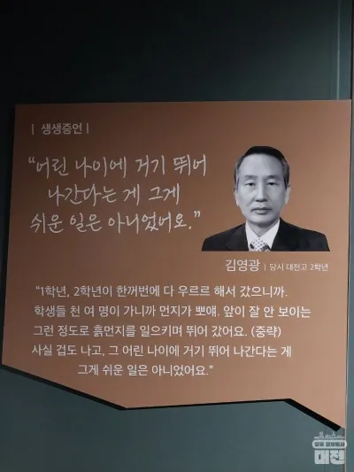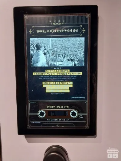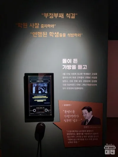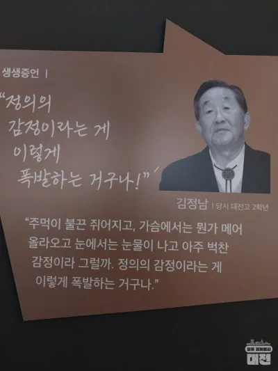 특히 3·8민주의거에 참가했던 당시 대전고 학생이었던 분들의 육성기록을 실제로 들을 수 있어서, 사실감이 더욱 극대화되는 효과가 있었습니다. 전시자료를 눈으로만 보는 것을 넘어 시위에 참가했던 분들의 실제 육성을 들으면서 전시물을 관람하면 어느새 그 현장에 있는 것 같은 기분이 듭니다. 3·8민주의거 기념관을 방문하게 된다면, 꼭! 육성기록물을 청취하면서 전시물을 관람할 것을 적극 추천합니다.