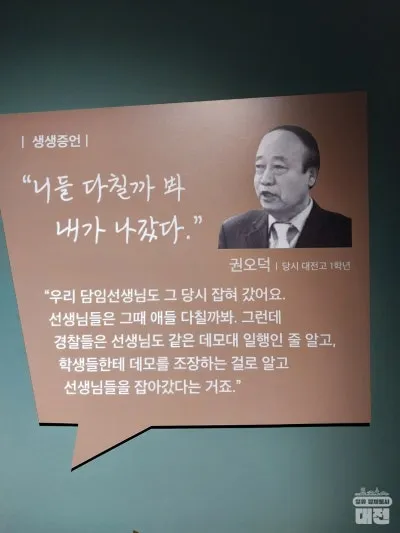 17~18세의 어린 나이에 총칼을 들고 있는 진압경찰 앞으로 나서는 것이 정말 쉽지 않았을 것 같습니다. 당시 중학생이던 문화해설사님의 설명으로는 당시 경찰은 M1-카빈 소총에 대검을 착검했다고 합니다. 또한 백차(현재 경찰순찰차)와 기마경찰대도 운용하고 있었다고 합니다. 전시자료를 보니 경찰이 몽둥이를 학생들에게 사정없이 내리치는 장면도 있습니다. 정말 민주주의를 향한 강렬한 정의감이 폭발하지 않으면 할 수 없는 행동이었겠구나라는 생각이 들었습니다.
