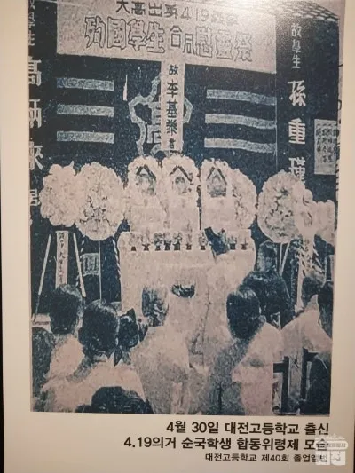 기념관 1층에는 3·8민주의거 당시의 생생한 사진 자료와 학생백일장 수상작이 전시되어 있습니다. 학생들이 체포되거나 시위하는 사진 자료에서 그 당시의 분위기를 간접적으로 체감할 수 있어 좋았습니다. 전시자료 중 1960년 4.19의거에 참가했다가, 경찰의 총탄에 맞아 순국한 대전고 출신의 3명의 합동위령제 모습을 담아봤습니다.