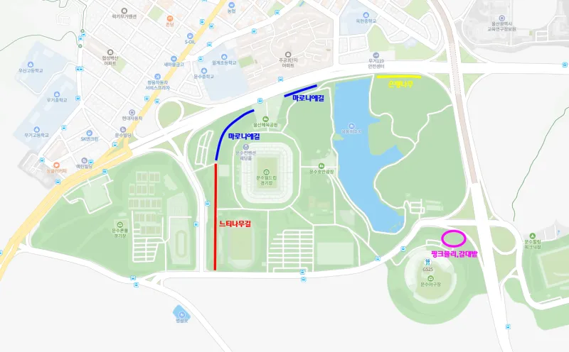 아래 지도는 울산 문수 경기장 주변의 지도입니다.