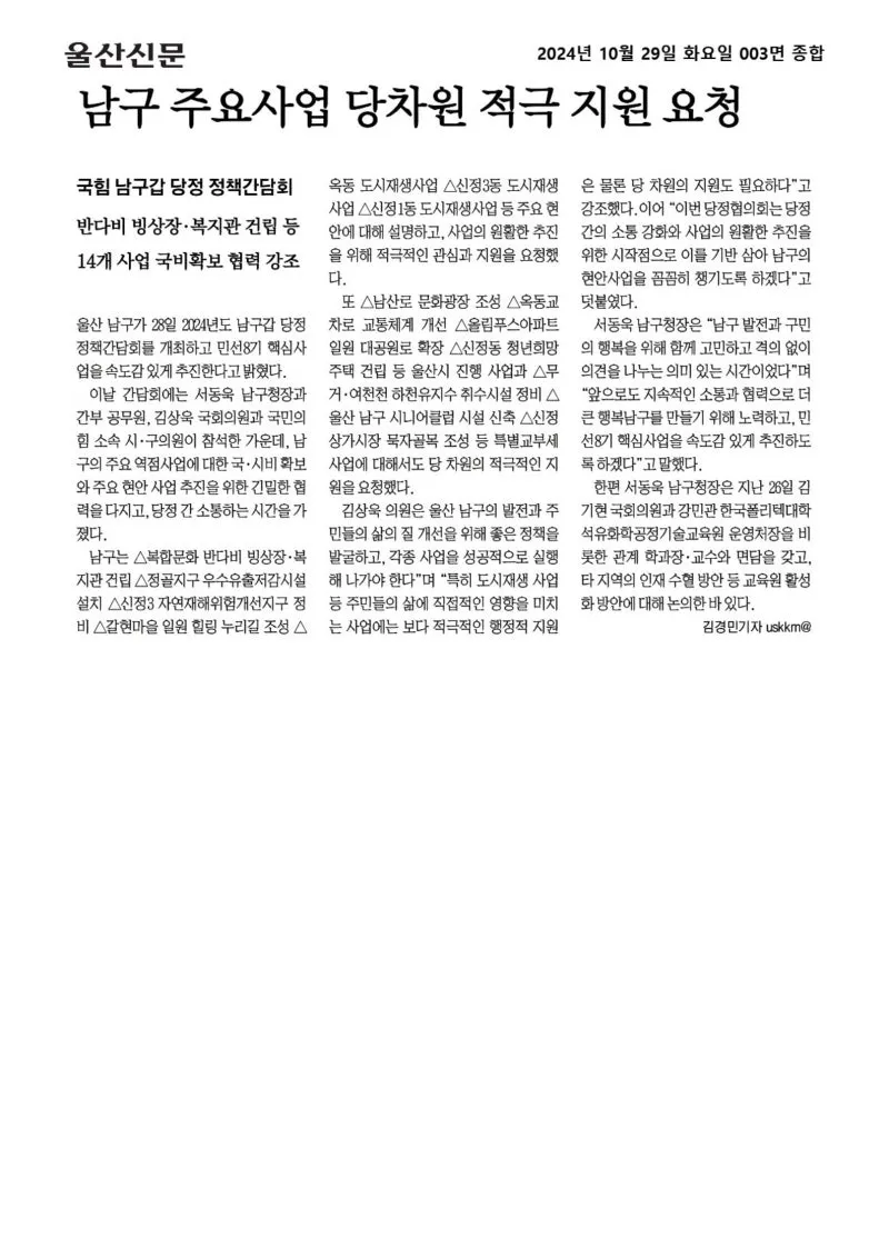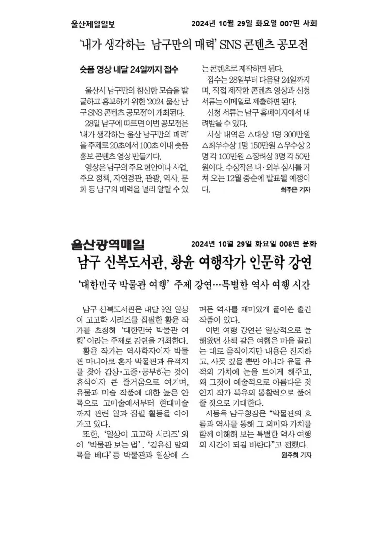 {"title":"[행복남구 오늘의신문] 🔥울산 남구 발전을 위해 지속적으로 소통하고 협력하겠습니다 !🤩╰(*°▽°*)╯ (10월 29일 화요일)","source":"https://blog.naver.com/ulsan-namgu/223637855721","blogName":"울산광역시..","blogId":"ulsan-namgu","domainIdOrBlogId":"ulsan-namgu","nicknameOrBlogId":"울산광역시남구","logNo":223637855721,"smartEditorVersion":4,"meDisplay":true,"outsideDisplay":false,"cafeDisplay":false,"blogDisplay":false,"lineDisplay":true}