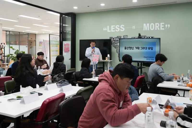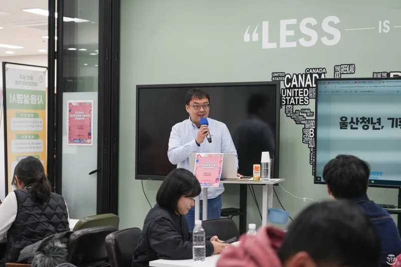 이날 성과공유회는 1년을 돌아보는 영상 시청을 시작으로 (전)울주군청년센터장 이태호 대표님의 '울산청년, 기획 그리고 모임'이라는 주제로 강의가 열렸습니다.