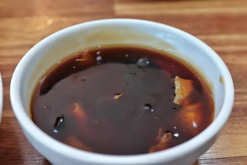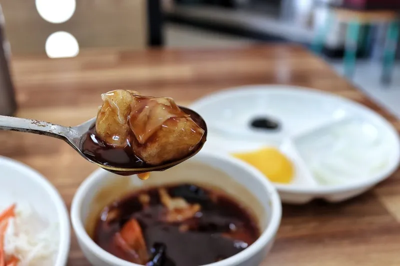 짜장을 먹는 중간에 주문한 미니 탕수육의 소스가 먼저 나와 소스를 한 스푼 가득 떠서 먹었는데, 시나몬 향도 나는 것이 번개관 만의 노하우 담긴 특제 소스 같더군요.