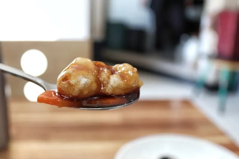 저 같은 경우는 전분 옷을 입은 채 바삭하게 튀긴 고기를 소스에 다시 푹 찍어서 소스 가득 떠 올린 숟가락에 놓아서 떠먹는 떠먹으로~~~ㅎㅎㅎ