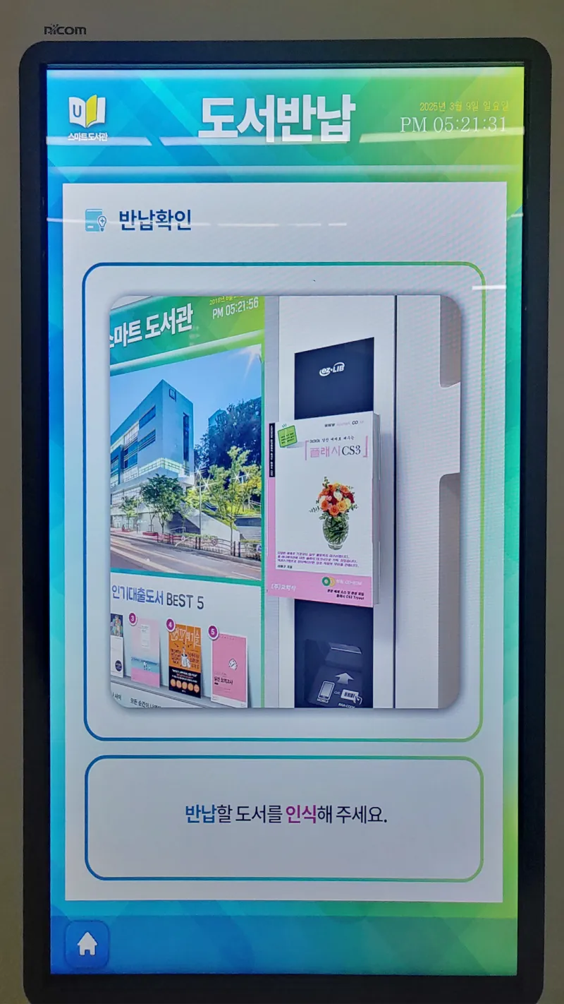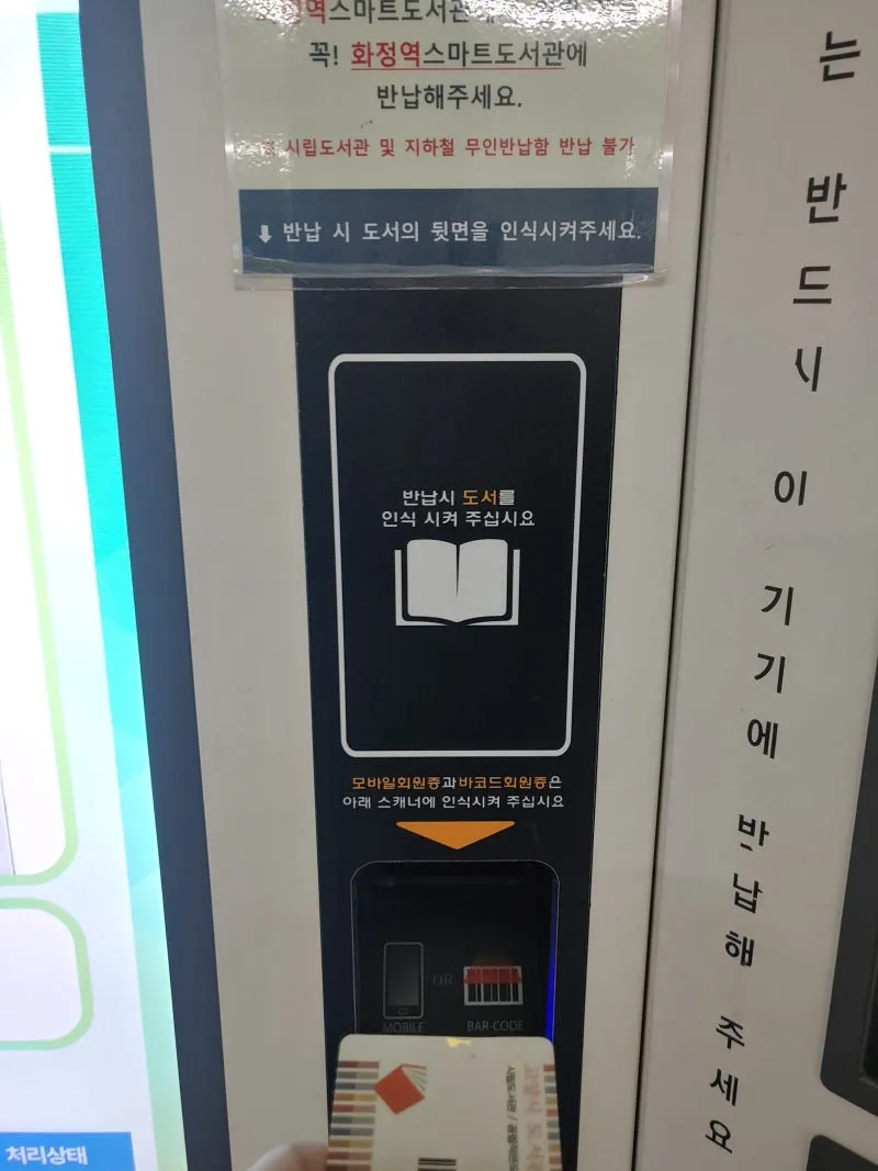 고양시 도서관 회원증을 리더기에 인식시킵니다.