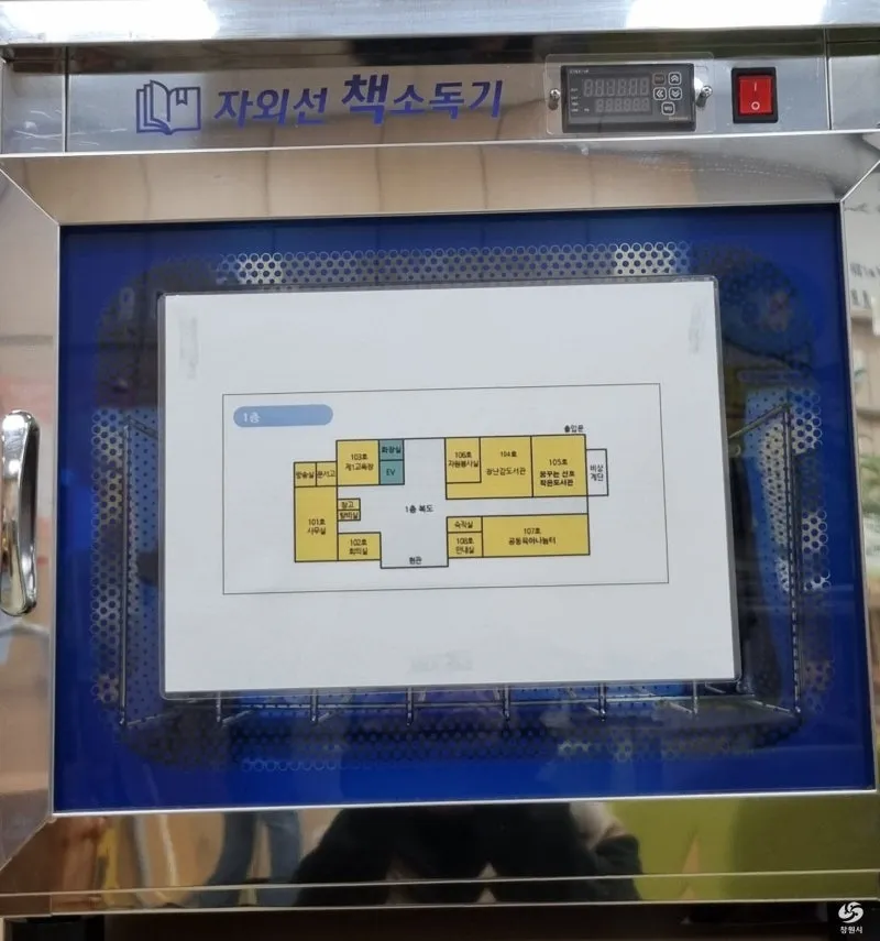 도서관이면 어디든 비치하고 있는 자외선 책 소독기도 있습니다. 그리고 1층 안내도가 부착되어 있어 위치를 파악하는데 아주 편리합니다. 도서관 바로 옆에 장난감 도서관, 공동육아 나눔터가 있어 여러 활동이 가능해 안성맞춤입니다.
