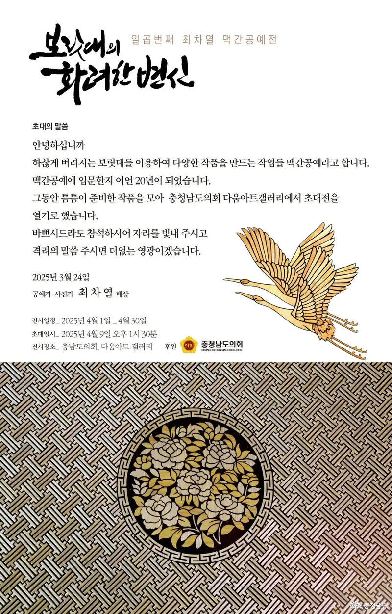 충남도의회 다움아트 갤러리에서 보릿대의 화려한 변신 <일곱번째 최차열 맥간공예전>이 열립니다.