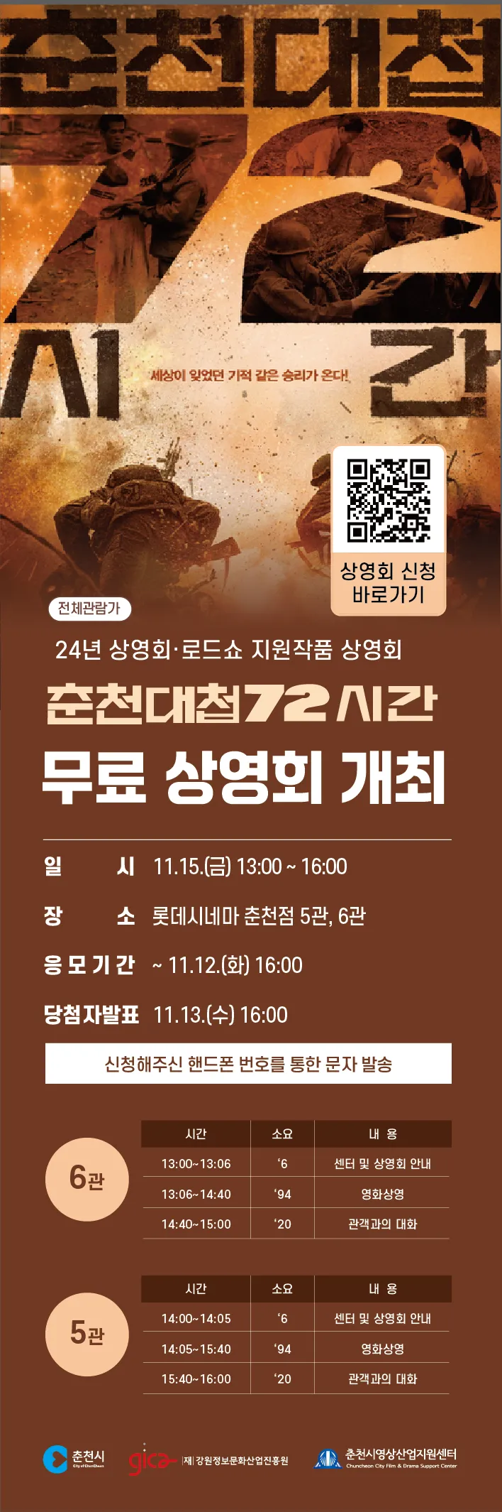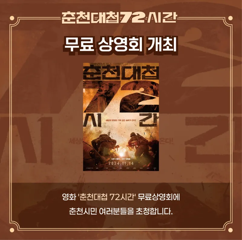 24년 상영회 및 로드쇼 지원사업 지원작 영화 '춘천대첩 72시간' 무료 상영회