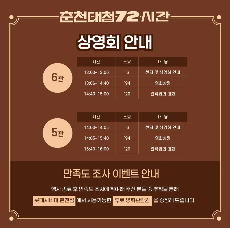 일 시 : 2024년 11월 15일(금) 13:00 ~ 장 소 : 롯데시네마 춘천점 5관, 6관 응모기간 : ~ 2024년 11월 12일(화) 16:00 당첨자 발표 : 2024년 11월 13일 (수) 16:00 신청해주신 핸드폰 번호를 통한 당첨자 문자발송 예정 입니다. <문의사항> 춘천시영상산업지원센터 033-245-6333 불가피한 상황으로 참석하지 못하는 경우 연락 바랍니다. 불참석 인원에 따라 발생하는 추가당첨자는 개별 통지예정입니다. ※ 노쇼 대상자는 추후 행사 신청에서 제외 됩니다. ※영화 상영 종료후 GV(관객과의 대...