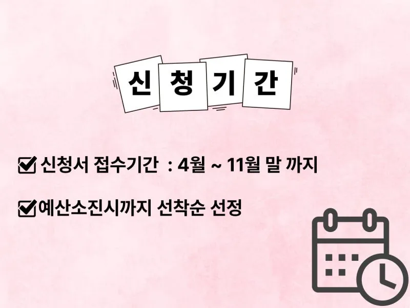 신청서 접수 일시는 2025. 4월 부터 2025. 11. 30 까지이나, 예산소진시 종료일 전이라도 조기 마감될 수 있습니다.