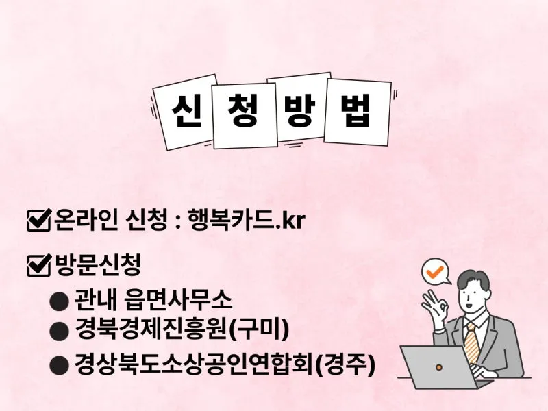 신청서 접수방법은 온라인 접수와 방문접수 방법이 있으며, 온라인 접수는 행복카드.kr 에서 직접 접수 가능합니다.