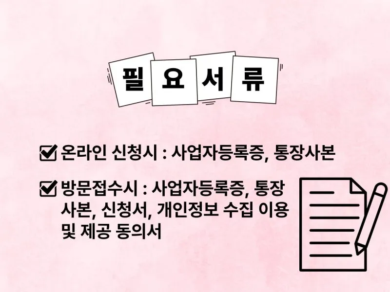 방문접수 시 : ① 사업자등록증, ②통장사본, ③신청서(서식1) ④ 개인정보 수집이용 및 제공 동의서(서식2)가 필요합니다.