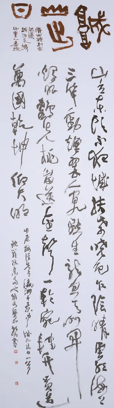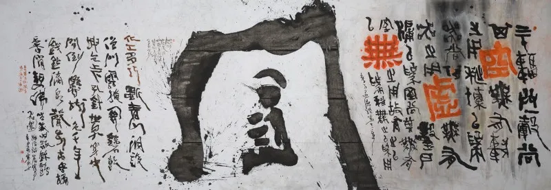 대필(大筆)로 비바람을 피해 굴(窟)에서 수도하는 인간을 형상화한 그림이 강렬하다. 붉은 먹으로 쓴