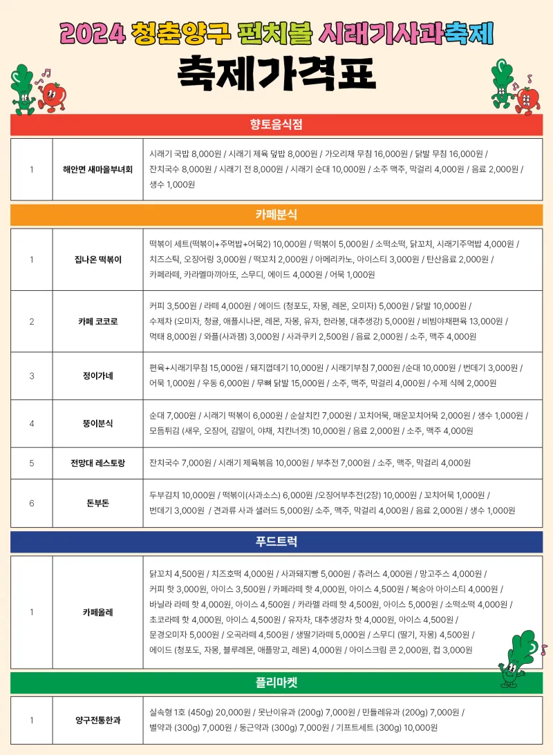 2024 청춘양구 펀치볼 시래기사과축제 참여부스 메뉴 및 가격표