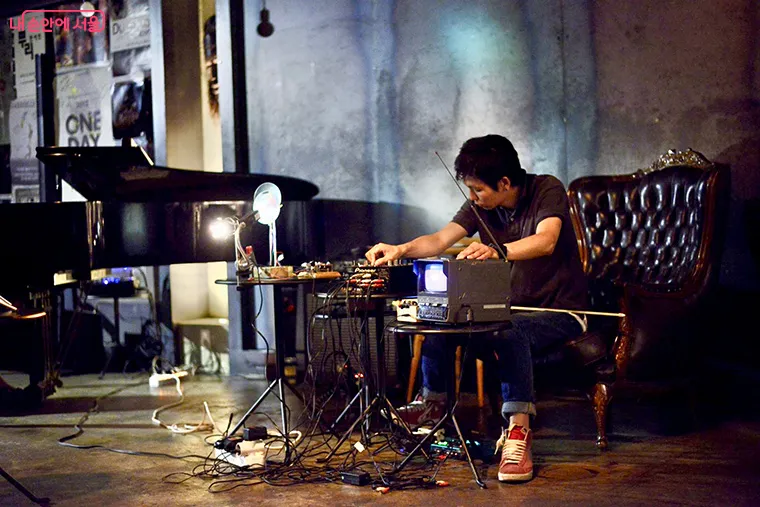 사운드는 언제나 살아있었다》전형산, <뜻밖의 소리> 전시 퍼포먼스 전경 (2015, 사진: 작가 제공)