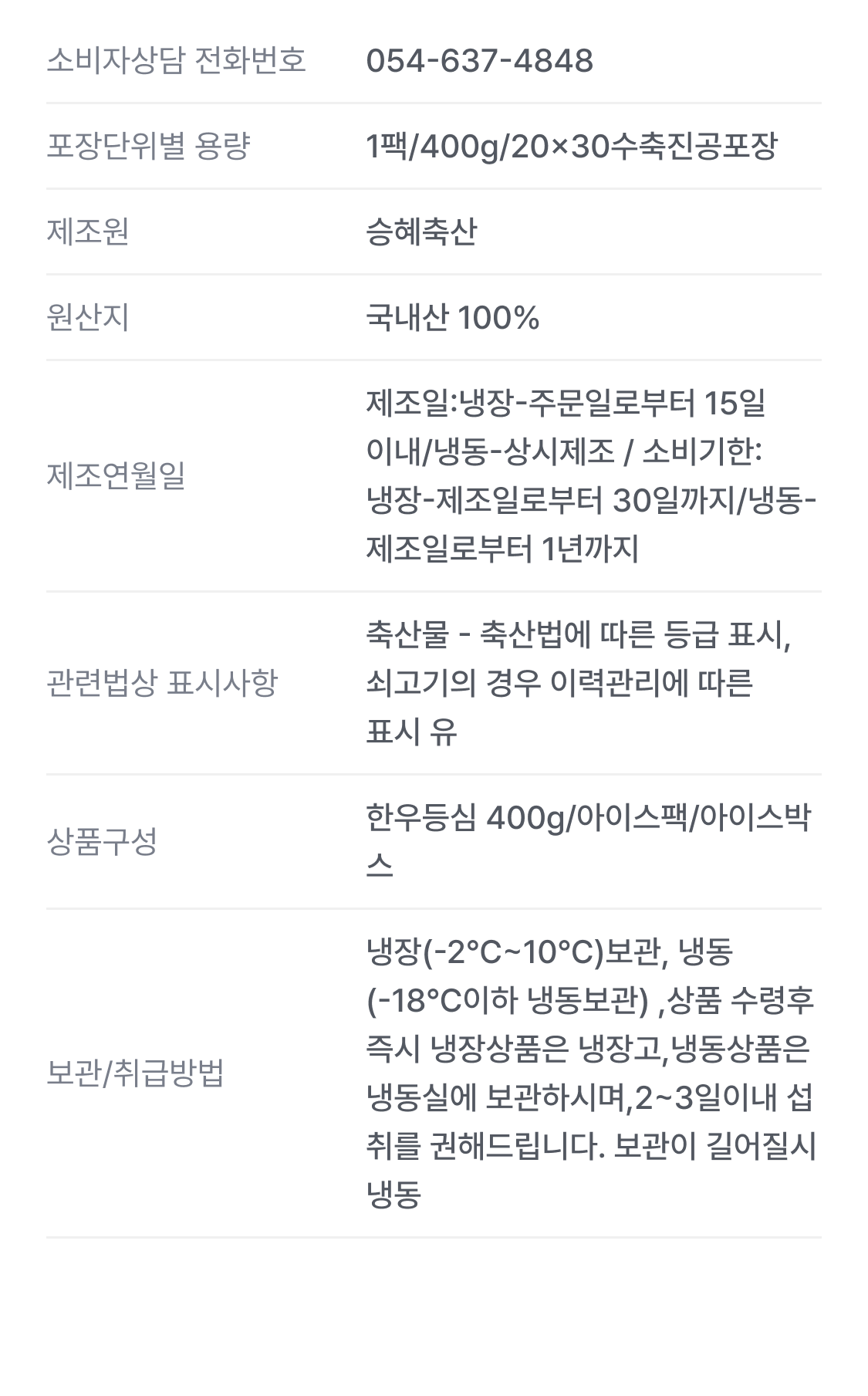 한우는 공기 접촉이 차단되면 표면이 갈색 또는 어두운 색으로 변하는 '갈변 현상'이 나타날 수 있습니다. 이는 육류 내 ‘미오글로빈’이라는 성분이 산소와의 접촉이 줄어들며 발생하는 자연스러운 반응으로, 제품의 신선도나 안전성과는 무관합니다.개봉 후 산소와 다시 만나면 원래의 선홍빛을 되찾으니 안심하고 드셔도 좋습니다.