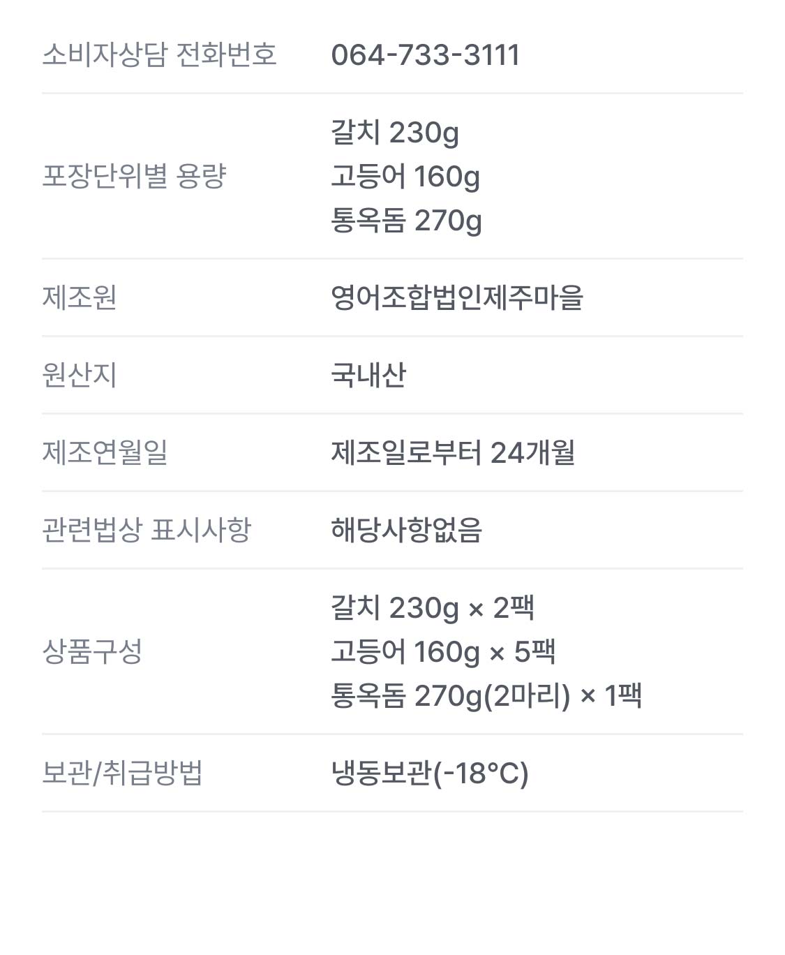 갈치 230g2팩 / 고등어필렛 160g5팩 / 통옥돔 270g(2마리)*1팩