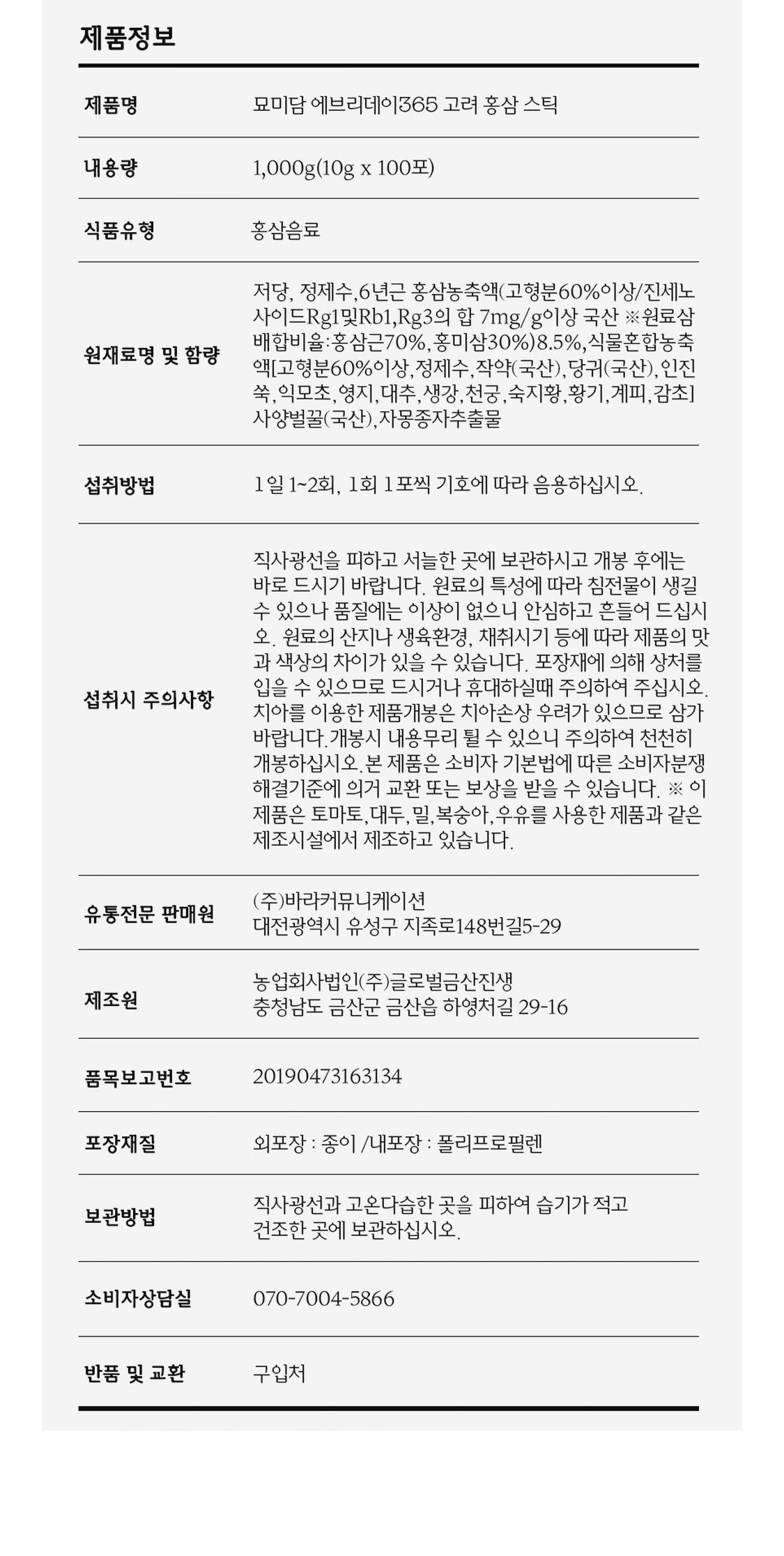 제품명 : 모미담 에브리데이 365 고려 홍삼 스틱 내용량 : 1,000g (10g X 100포) 식품 유형 : 홍삼음료 원재료명 및 함량 : 홍삼농축액(고형분 60% 이상, 국내산) 7mg 함량 이상/g 이상, 6년근 원료 삼배합 비율 : 홍삼근 70%, 홍미삼 30% 혼합 농축액 (고형분 60% 이상, 정제수, 작약 (국산), 당귀 (국산), 인진쑥, 익모초, 영지, 대추, 생강, 천궁, 숙지황, 황기, 계피, 감초), 사양 벌꿀 (국산), 자몽 종자 추출물