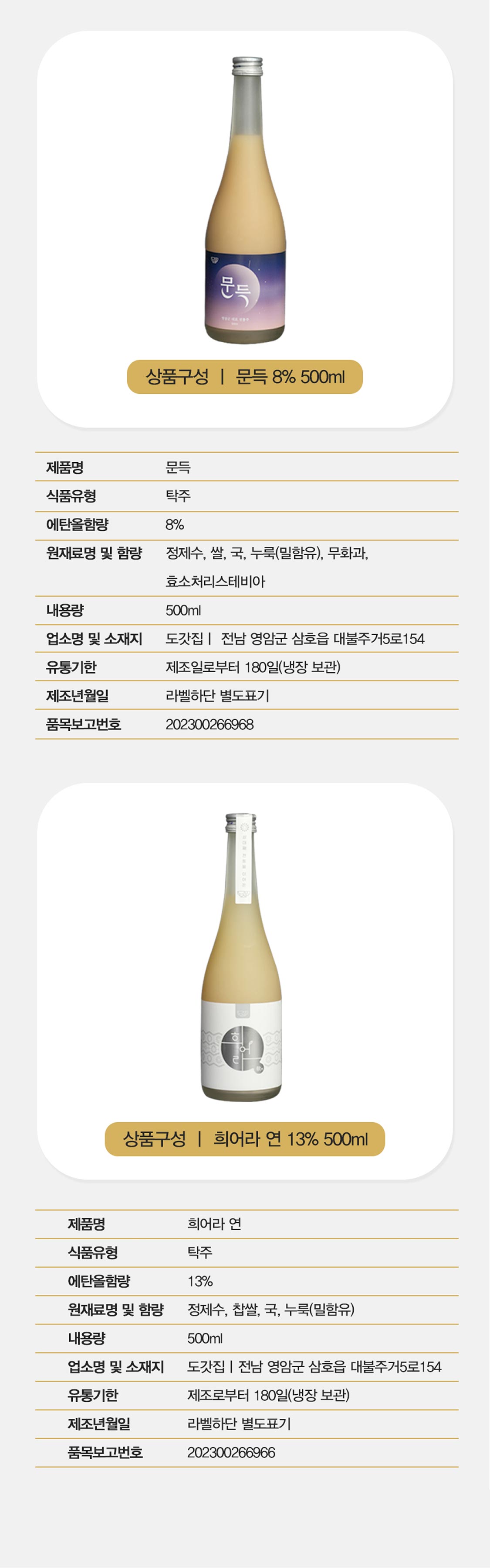 품목명희어라 연식품유형탁주에탄올함량13%원재료명 및 함량정제수, 쌀, 누룩(밀함유)내용량500ml업소명 및 소재지도갓집유통기한제조일로부터 180일(냉장 보관)제조연월일라벨 하단부 별도 표기품목보고번호202300266966