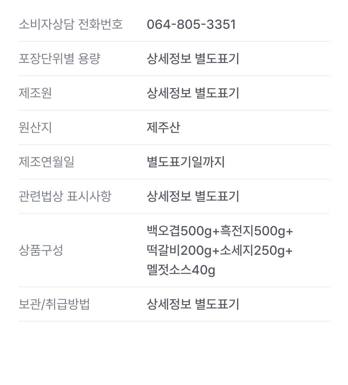 얼리지 않은 냉장육 이보다 좋을 수 없다 5종 선물세트 상품구성 01 백돼지 오겹살 500g 살코기와 지방의 절묘한 조화로 씹을수록 고소하며 육즙이 풍부합니다. 02 흑돼지 앞다리살 500g 담백한 고기 맛이 일품인 앞다리살. 볶음고기, 찌개 등 여러 요리에 활용이 가능한 가성비 좋은 부위입니다. 03 제주흑돈 수제떡갈비 200g 흑돼지 육즙이 팡팡! 떡갈비 2개입으로 고소한 맛을 느낄 수 있습니다. 04 제주흑돈 불고기소시지 250g 제주 대파, 마늘을 첨가하여 전통적인 불고기 맛의 풍미를 더했습니다. 05 제주멜젓소스 40g 고기와 찰떡궁합! 제주산 멜젓으로 만든 프리미엄 멜젓 *떡갈비 및 소시지는 중량의 같은 다른제품으로 교체 될 수 있습니다.